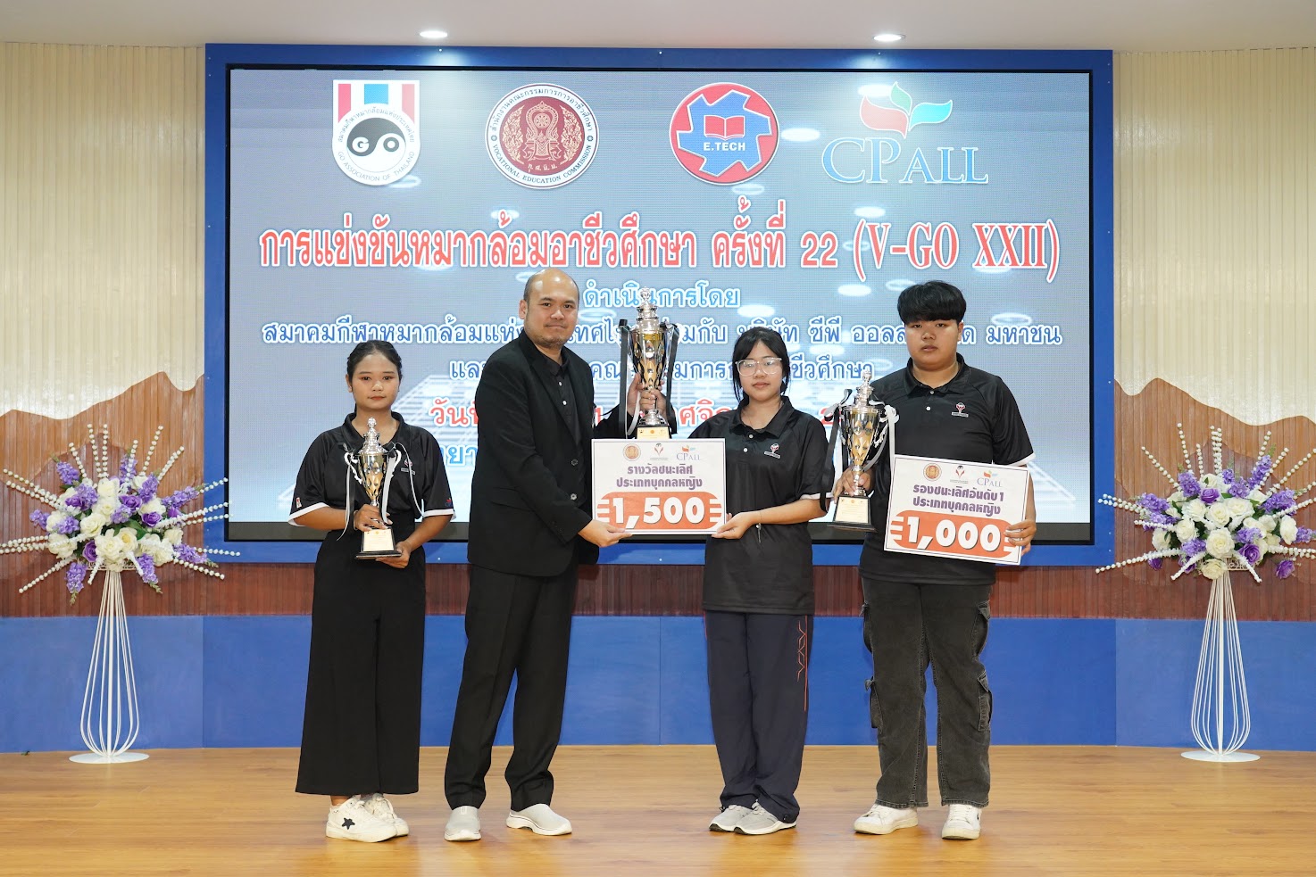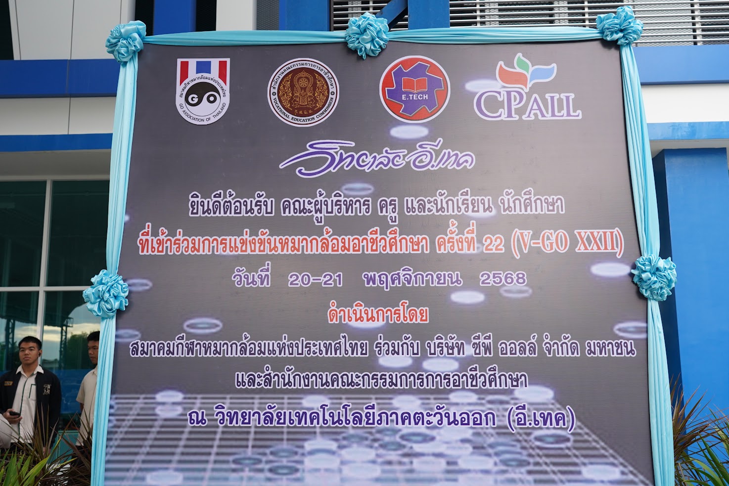 สมาคมกีฬาหมากล้อมแห่งประเทศไทย ร่วมกับบริษัท ซีพี ออลล์ จำกัด (มหาชน) สำนักงานคณะกรรมการการอาชีวศึกษา และวิทยาลัยเทคโนโลยีภาคตะวันออก (อี.เทค.) จัดการแข่งขันหมากล้อมอาชีวศึกษา ครั้งที่ 22 (V-GO XXII) เมื่อวันที่ 20 – 21 พฤศจิกายน พ.ศ. 2568 ณ วิทยาลัยเทคโนโลยีภาคตะวันออก (อี.เทค.) จังหวัดชลบุรี โดยมีนักกีฬาเข้าร่วมการแข่งขันกว่า 20 สถานศึกษา 180 คน และได้รับเกียรติจากท่าน ดร.ประเสริฐ กลิ่นชู ผู้อำนวยการวิทยาเทคโนโลยีภาคตะวันออก (อี.เทค.) เป็นประธานในพิธีปิดการแข่งขัน