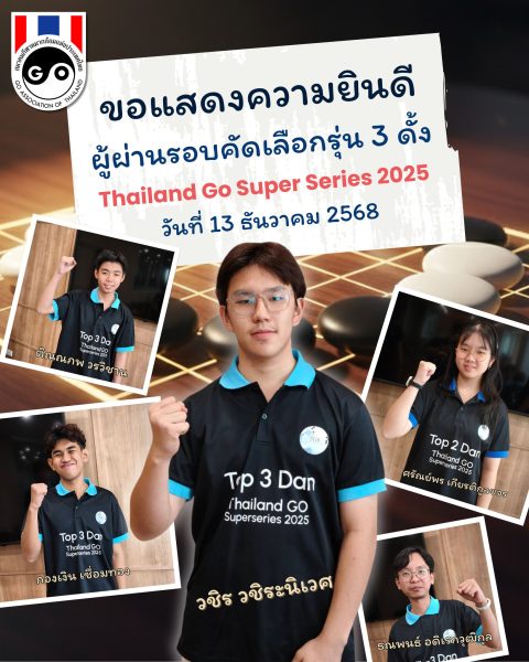 สมาคมกีฬาหมากล้อมแห่งประเทศไทย , บริษัท ซีพี ออลล์ จำกัด (มหาชน) ผู้จัดการแข่งขันหมากล้อม 14 รายการ, กองทุนหมากล้อม TGF และชมรม Thai Go Alumni จัดการแข่งขัน Thailand GO Super Series 2025 (รอบคัดเลือก 3 ดั้ง) เมื่อวันเสาร์ที่ 13 ธันวาคม 2568
