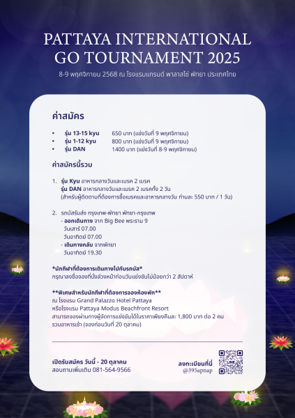 ข่าวประชาสัมพันธ์ รับสมัครแข่งขัน Pattaya International GO Tournament 2025 2025-10-07 186 ขอเชิญนักกีฬาหมากล้อมเข้าร่วมการแข่งขันหมากล้อมระดับนานาชาติสุดยิ่งใหญ่แห่งปี Pattaya International GO Tournament 2025 วันที่ 8-9 พฤศจิกายน ณ โรงแรมแกรนด์พาลาสโซ่พัทยา