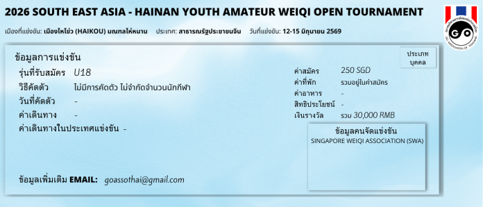 สมาคมกีฬาหมากล้อมแห่งประเทศไทย ขอเชิญชวนนักกีฬาเยาวชนสมัครเข้าร่วมการแข่งขันหมากล้อมในรายการ 2026 South East Asia – Hainan Youth Amateur Weiqi Open Tournament ณ เมืองไหโข่ว มณฑลไห่หนาน สาธารณรัฐประชาชนจีน