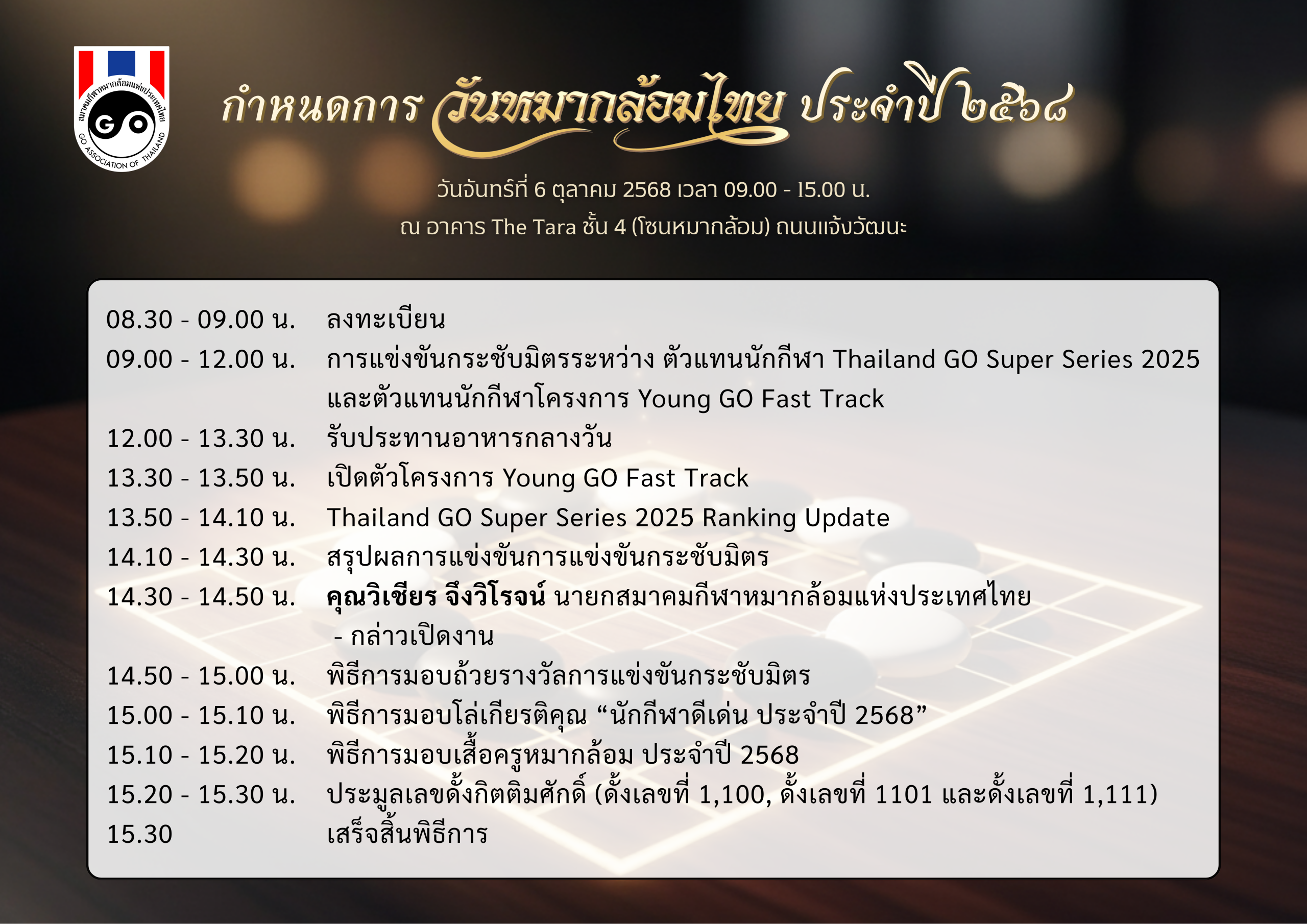 สมาคมกีฬาหมากล้อมแห่งประเทศไทย ขอเชิญชวนผู้ที่สนใจเข้าร่วมงาน “วันหมากล้อมไทย ประจำปี 2568” ในวันจันทร์ที่ 6 ตุลาคม 2568 ณ อาคาร The Tara ชั้น 4 ตั้งแต่เวลา 09.00 – 15.30 น. เพื่อร่วมเฉลิมฉลองและเป็นเกียรติแก่วงการหมากล้อมไทย